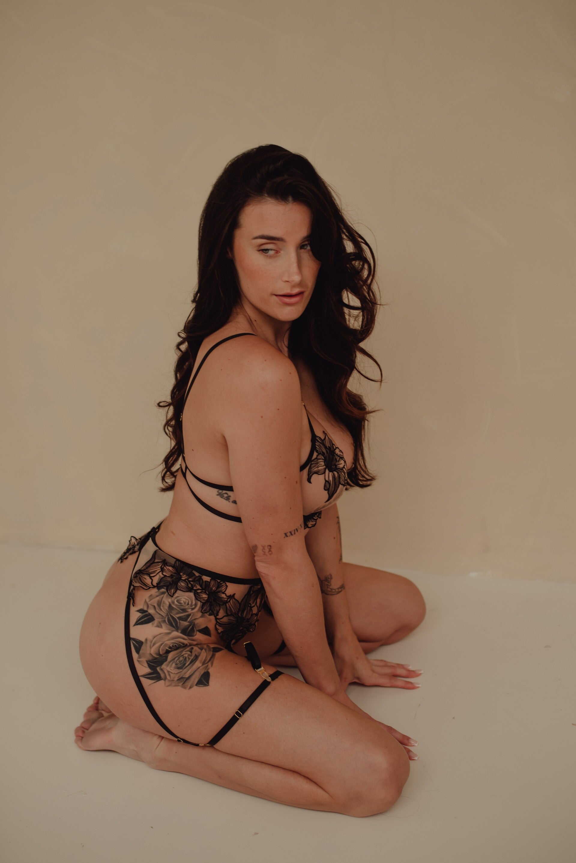 Deze set heeft een vrouwelijke uitstraling met haar prachtige bloemen. De set sluit mooi aan en heeft prachtige details zoals de gouden rondjes bij de beha-bandjes. De set bestaat uit een beha, jarretel, string en beenbandjes.